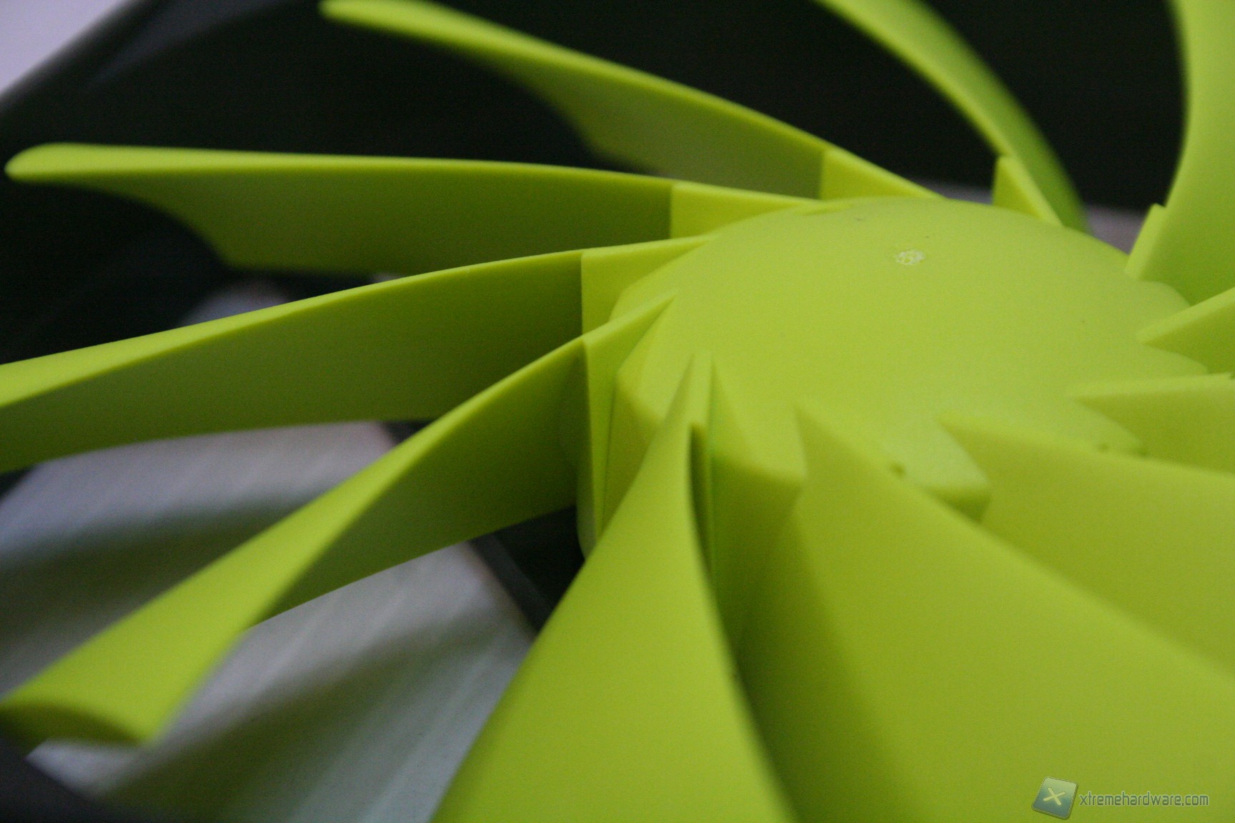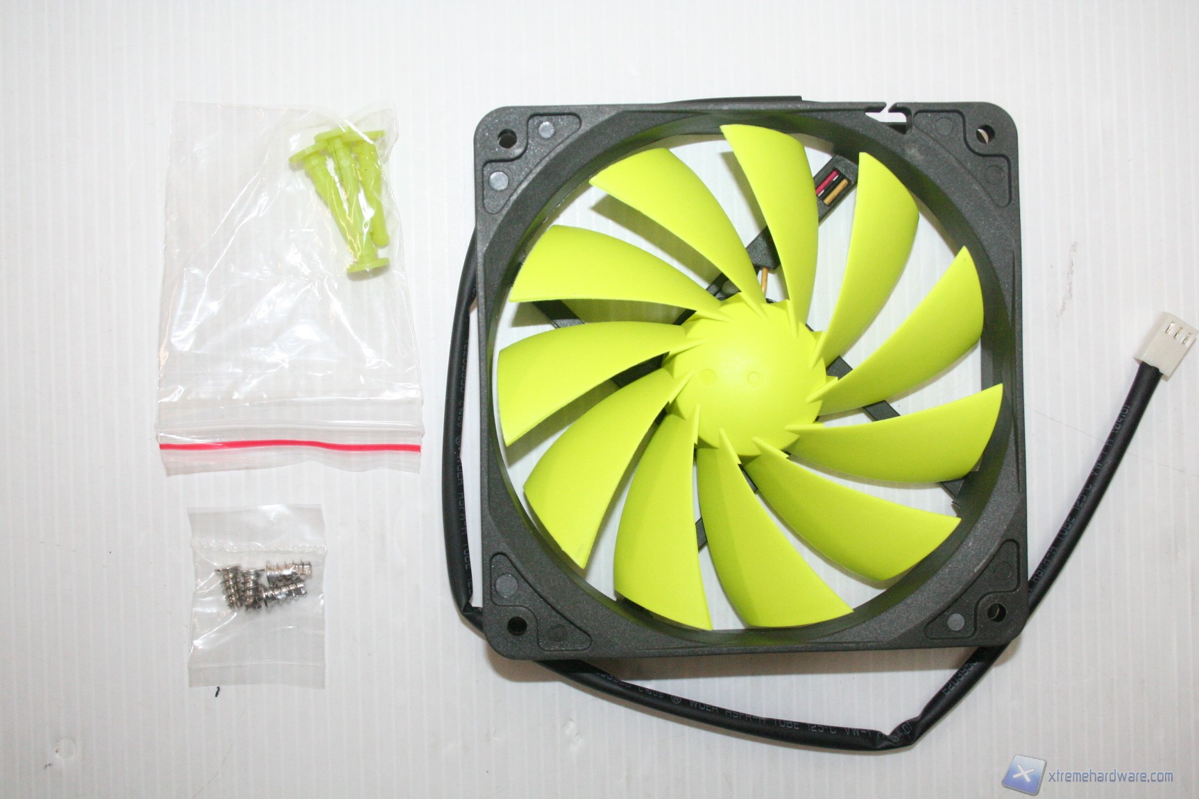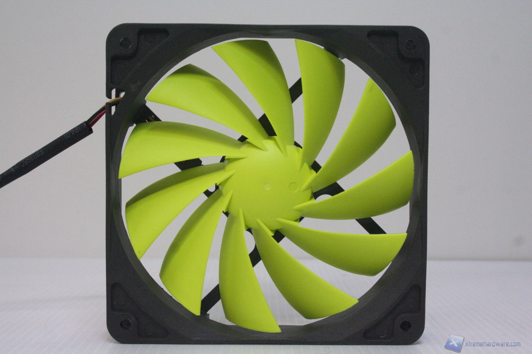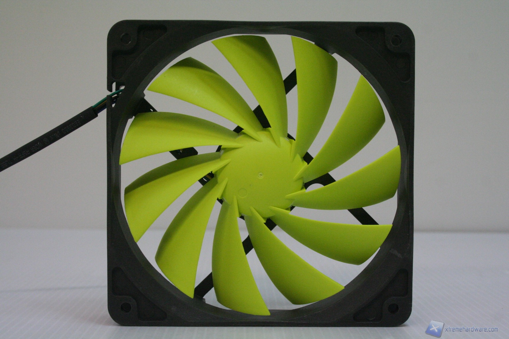 Ora analizziamo il prodotto di punta, il modello da 120mm. La struttura questa volta si differenzia molto dai modelli precedenti, in quanto sono presenti numerose ottimizzazioni strutturali peculiari. Innanzitutto la colorazione verde limone scuro delle pale è rimasta invariata, però queste ultime sono in numero maggiore (11) e sono adatte alla ventilazione sia di case, sia di dissipatori. Il motore è di dimensioni più contenute e presenta un design che tende a far incanalare l’aria in maniera molto più lineare, grazie a degli intagli verticali di immissione tangenziale, e grazie anche al telaio bombato nella parte superiore. Nel modello 120P c’è la funzionalità PWM. Non è noto l’MTBF, sebbene venga specificato il bearing (Hydro-dynamic bearing). Il numero delle pale permetterà un CFM ed una pressione statica migliori e come vedremo le performance complessive saranno davvero ottime, complice però anche l’ammontare degli RPM complessivi. Per i modelli 1200 e 1201 ovviamente troviamo caratteristiche tecniche inferiori, per via delle diverse specifiche, però la bontà rimane invariata. Le pale anche in questo caso non sono removibili. Il target di utenza è specifico per tutti coloro i quali necessitano di ventole interessanti, soprattutto per dissipatori o radiatori, andando al risparmio rispetto a modelli della concorrenza molto più costosi. La rumorosità come vedremo sarà medio alta per la 120P però non eccessivamente; è presente un leggero ticking a bassi RPM però, cosa ben diversa da altre ventole della concorrenza tra cui Akasa e Noctua ad esempio. Per quanto riguarda lo sleeving è presente, peccato che sia di qualità davvero modesta, e stiamo usando un eufemismo.