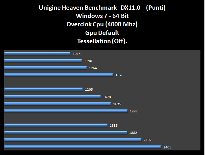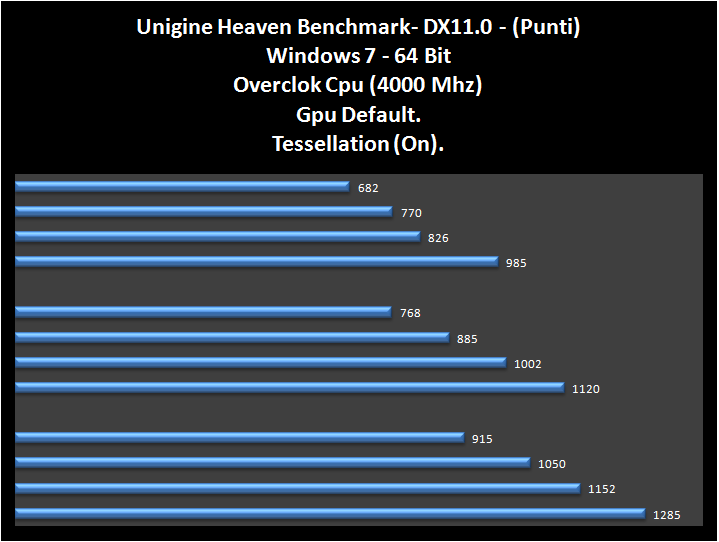 Il benchmark è stato testato in DX11 e con tessellation una volta attivato e una volta disattivato.